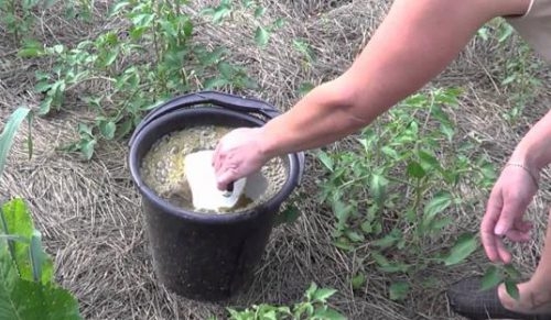 В ведро с водой добавляем 1,5 литра раствора, используем для полива не менее одного литра под куст.